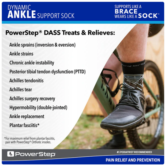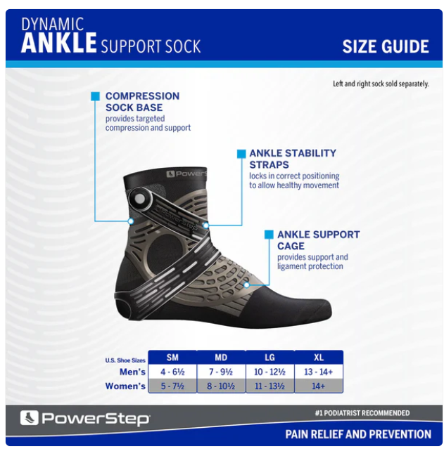 The PowerStep® Dynamic Ankle Support Sock helps individuals stay active and prevent injury. This compression sock and ankle brace in one can help improve ankle stability during a range of activities from walking to intense athletic competition. The low-profile design fits most shoes without compromising fit or functionality.